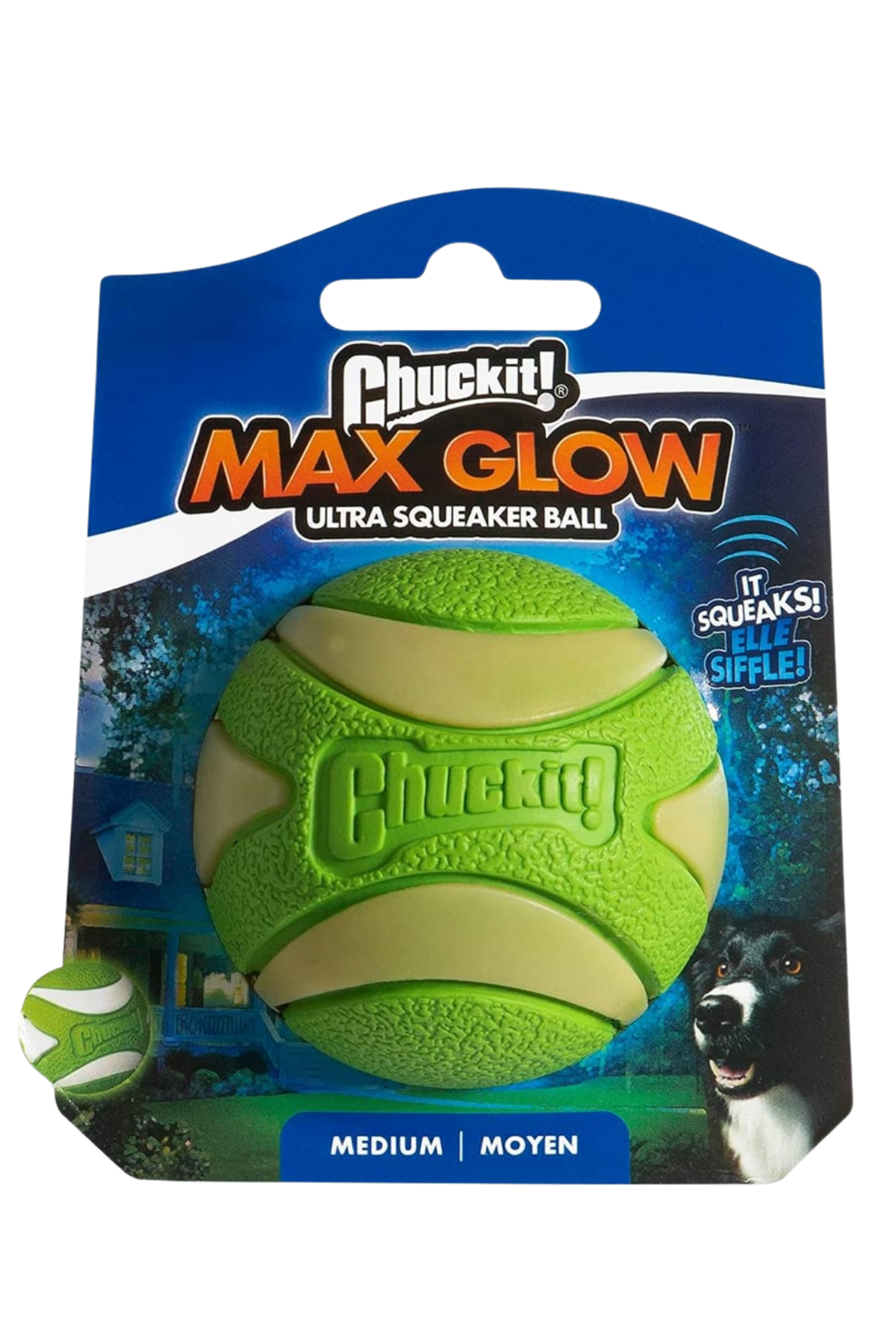 Chuckit en popüler oyuncaklarından olan gece parlayan Max Glow ve sesli Ultra Squeaker oyun topları şimdi tek topta buluştu.