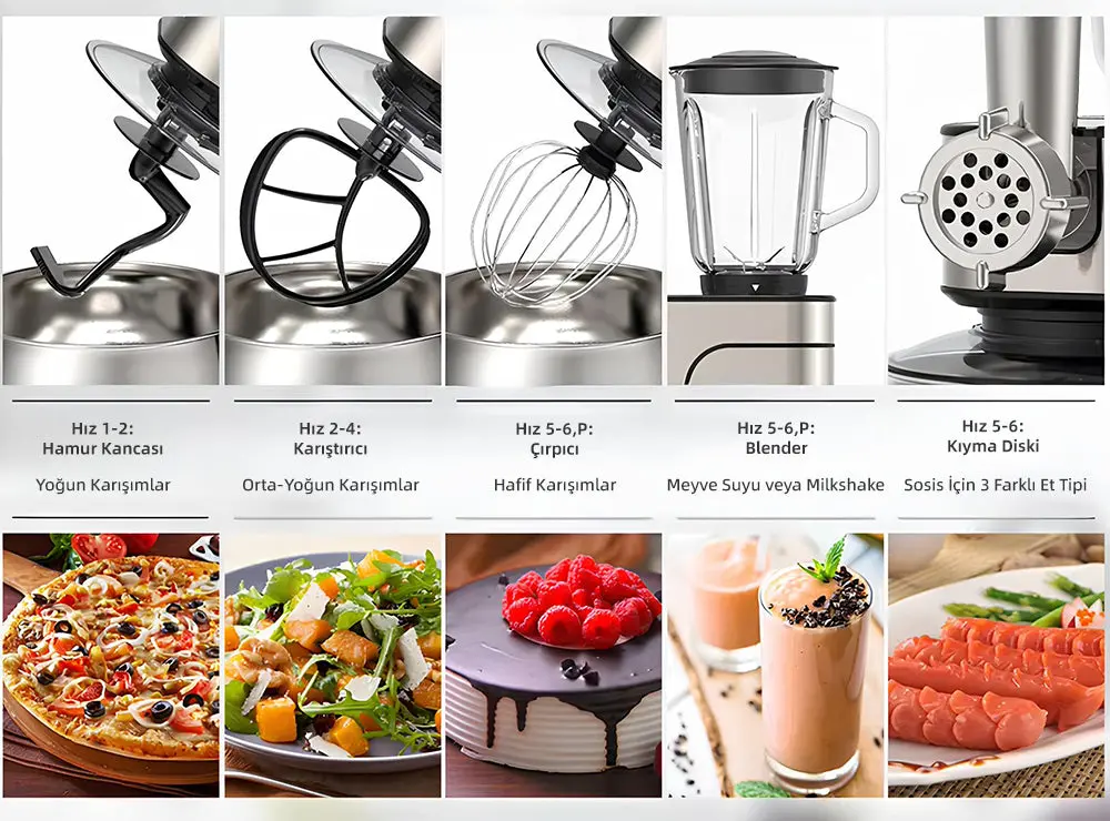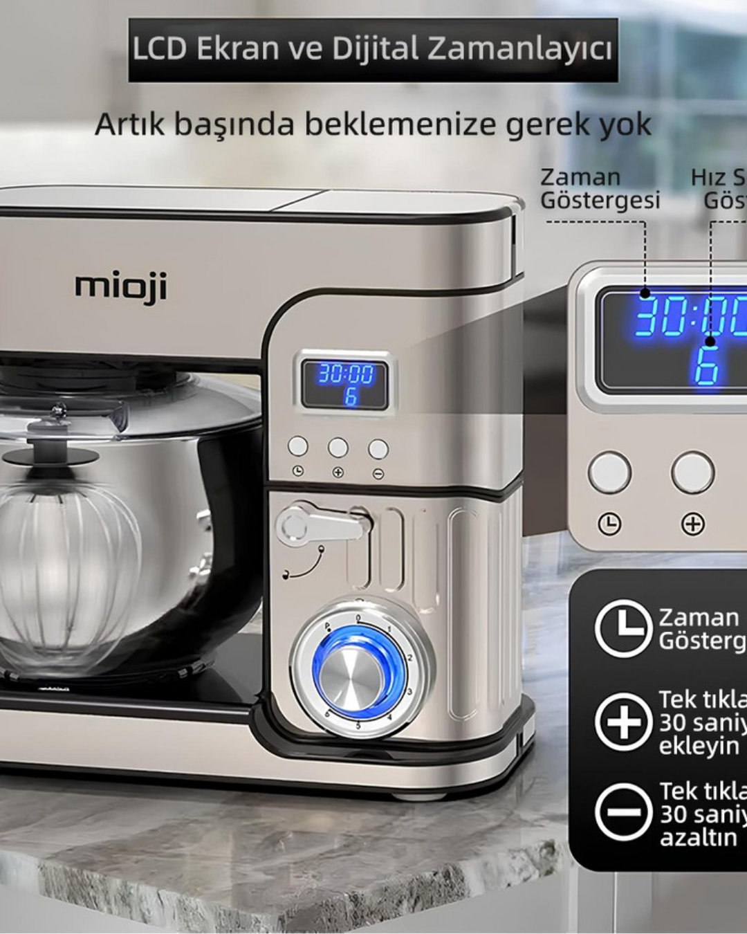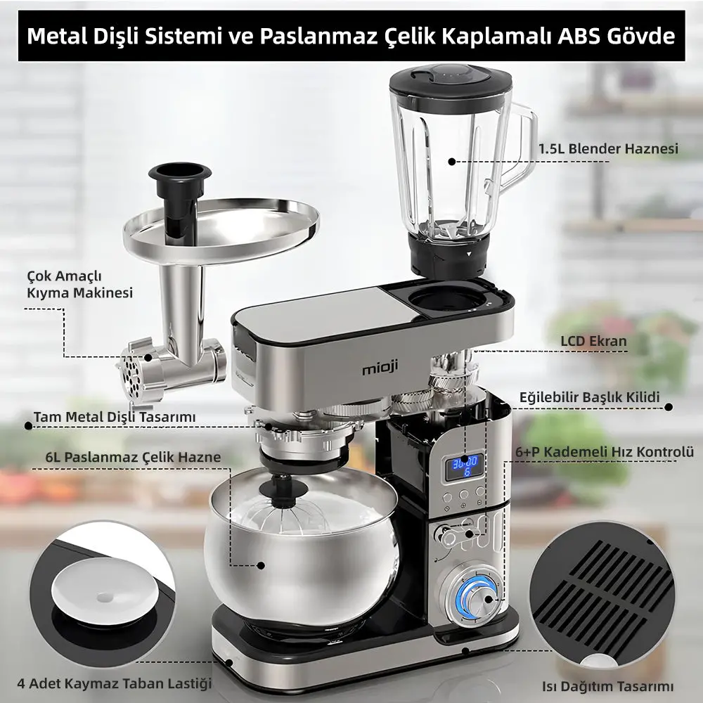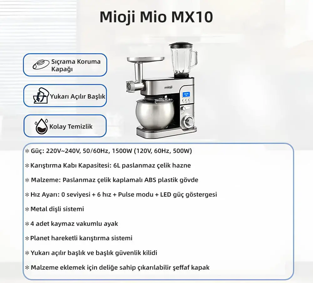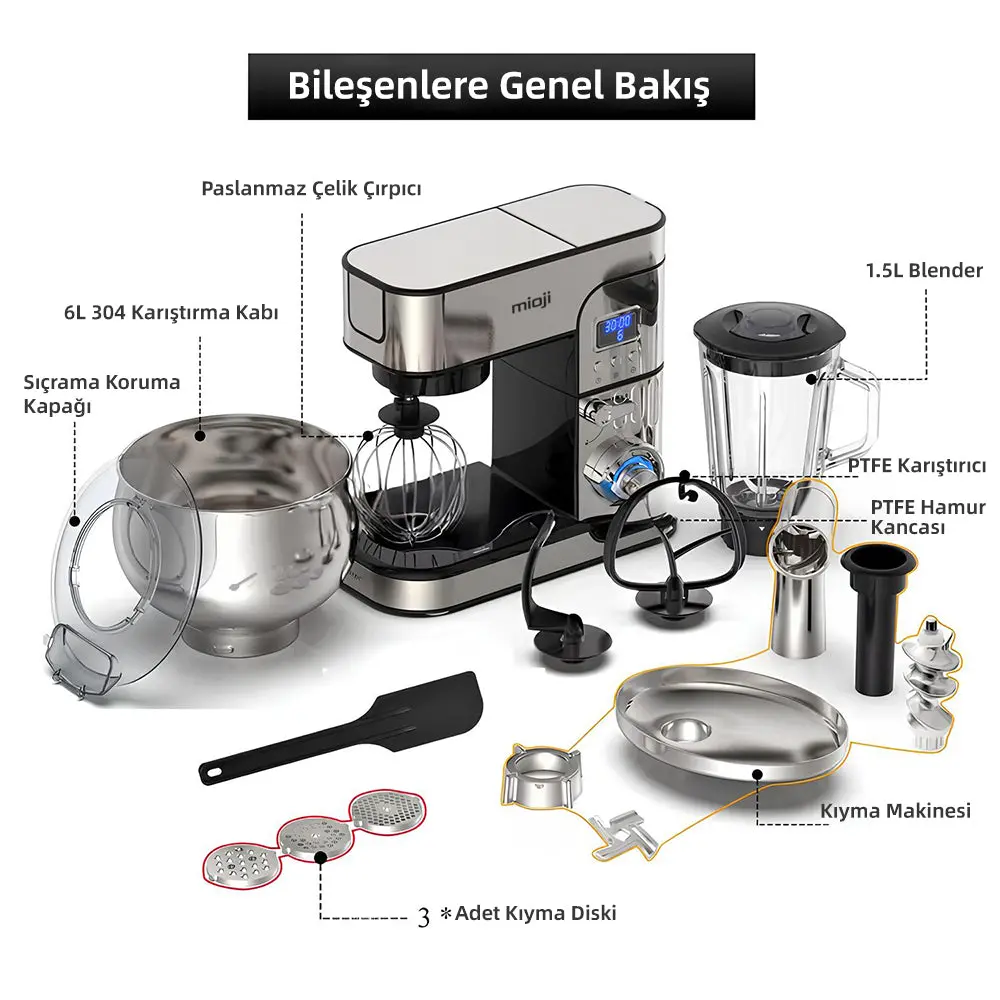Mioji Mio MX10 6L 1500W İnox 3'ü 1 Arada Mutfak Şefi Stand Mikser + Kıyma Çekme + Hamur Yoğurma (77442)
