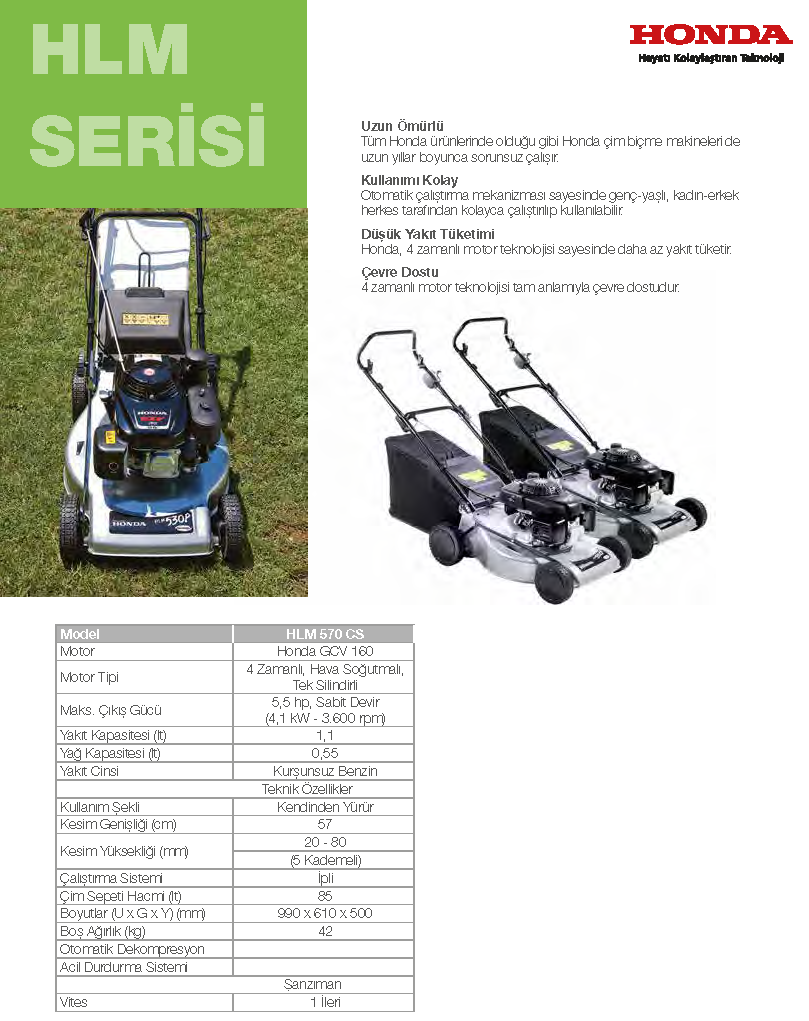 Ürün Özellikleri Ölçüler: 990 x 610 x 500 MM Silindir Hacmi: 170 CC Güç (Watt): 4100 Çalışma Genişliği: 57 CM Yakıt Türü: Benzin Devir: 3600 Devir/Dakika Ağırlık: 42 KG Yakıt Kapasitesi: 1100 ML İş Kapasitesi: 2499 m² Model: HLM 570 CS Çim Haznesi Kapasitesi: 85 L Çalışma Yüksekliği: 20 - 80 MM Marka: Honda