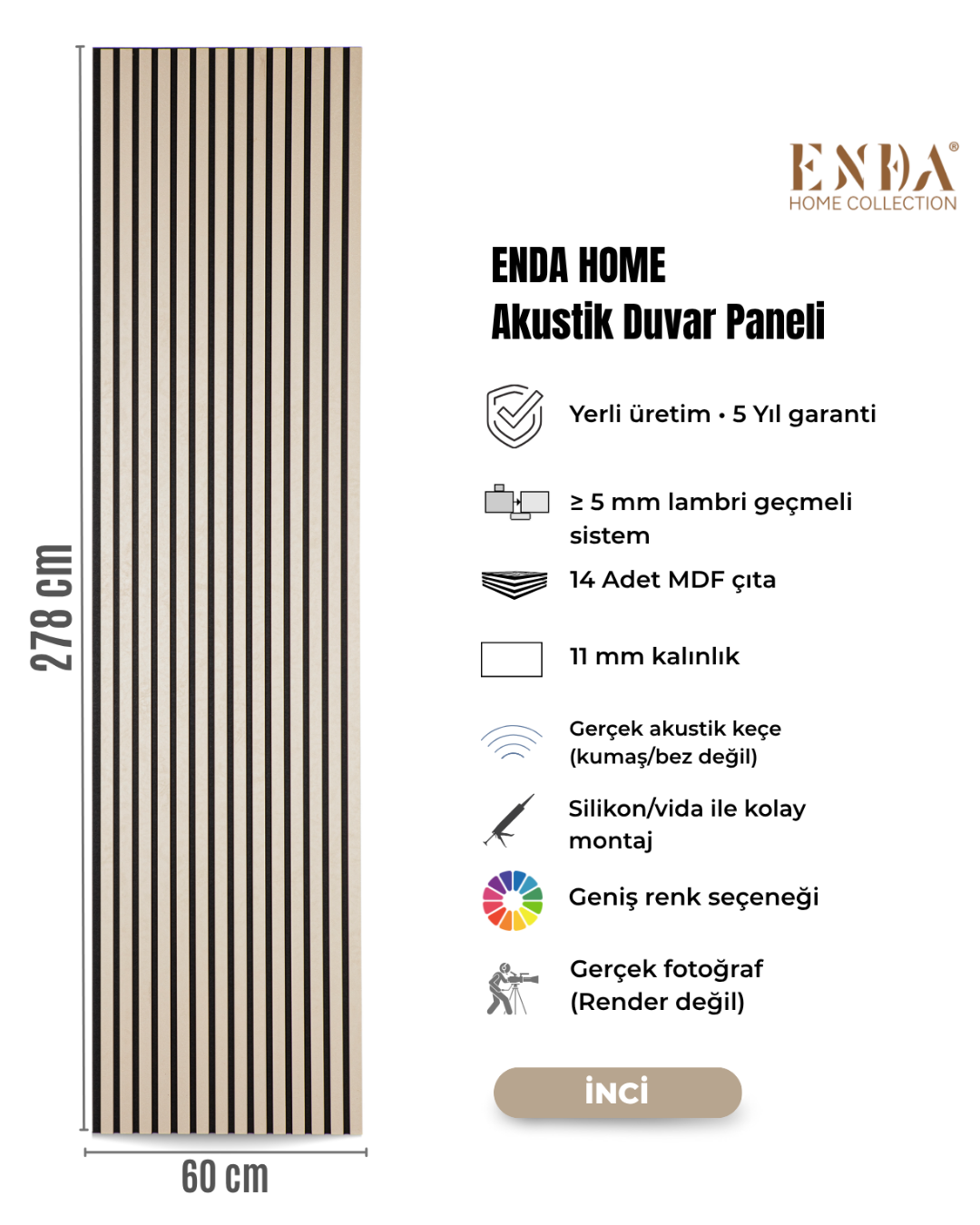 Enda Home MDF Akustik Duvar Paneli 60 x 278cm İnci