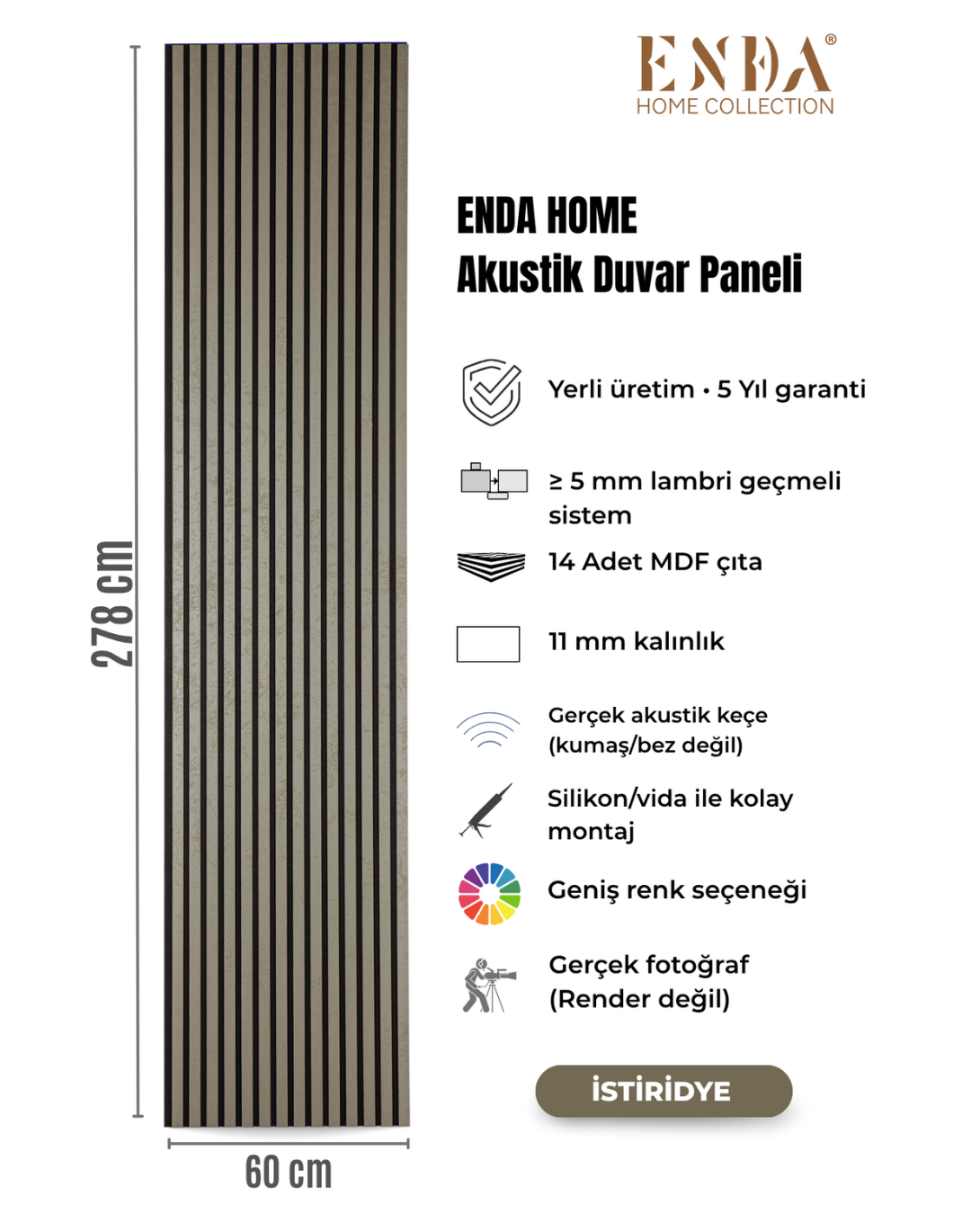 Enda Home MDF Akustik Duvar Paneli 60 x 278cm İstiridye