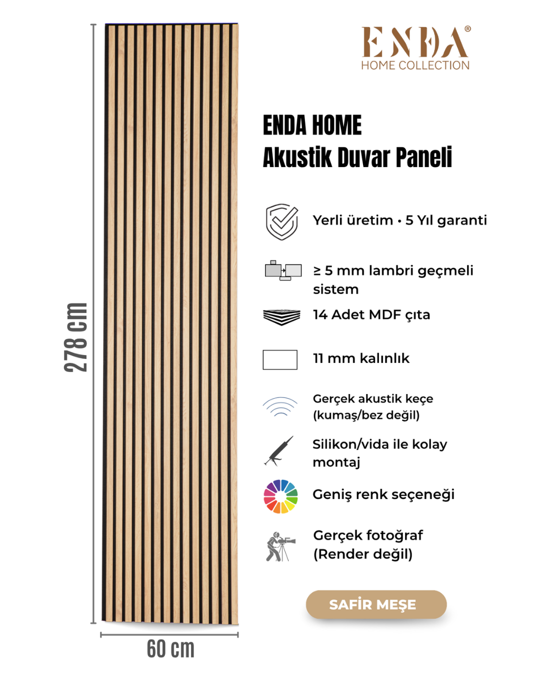 Enda Home MDF Akustik Duvar Paneli 60 x 278cm Safir Meşe