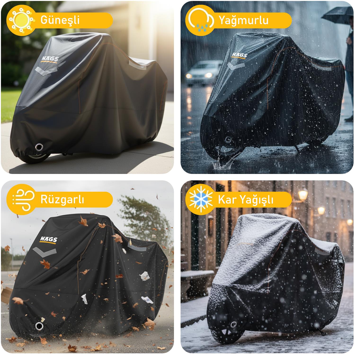 Haegs XXL Motosiklet Brandası, motosikletinizi dış ortam koşullarına karşı korumak için geliştirilmiş dayanıklı ve uzun ömürlü bir motor koruma kılıfıdır. Yüksek kaliteli 420D ağır hizmet tipi kumaş kullanılarak üretilmiş olan bu motosiklet örtüsü, güneş, yağmur, kar, toz ve çizilmelere karşı güçlü bir koruma sağlar.