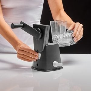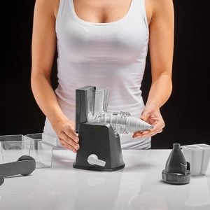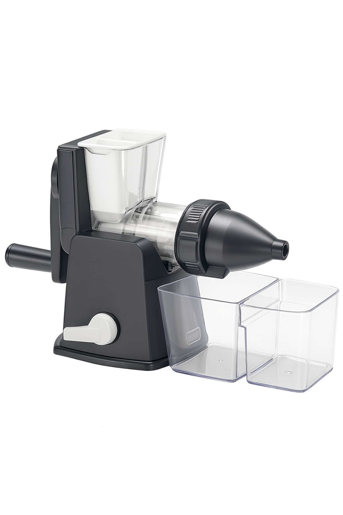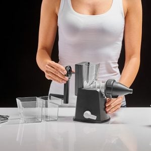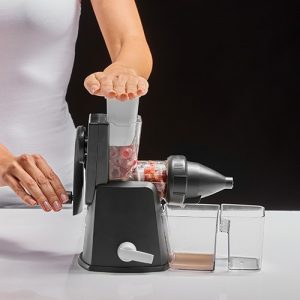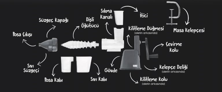 8- Kulpu saat yönünde yavaşça ama düzenli olarak çevirin. Sıkılmış su, sıvı süzgecinden direkt olarak sıvı kabına akacaktır. Posa ise aletin önündeki posa çıkışından posa kabına itilecektir.