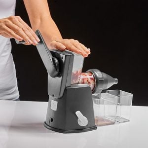 7.1 Eğer sert ve büyük meyve veya sebze sıkıyorsanız sadece bir tane hazneyi doldurun. Öncelikle hepsini ince dilimlere kesip öncelikle ince olan taraflarından hazneyi doldurun. Sıkışmayı önlemek için dilimleri teker teker koyun; ilk dilimin dişli öğütücü çemberine girmesinden sonra diğer dilimleri doldurun.