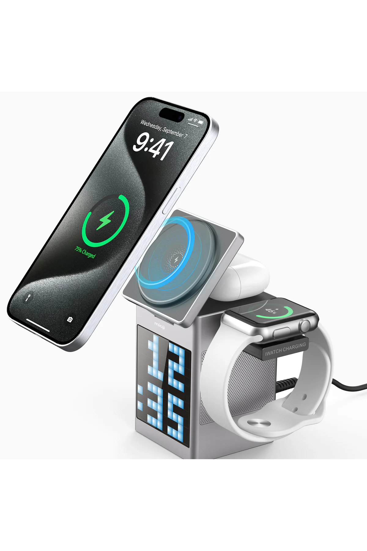 kablosuz şarj, saat ve hoparlör özelliklerini tek bir cihazda birleştiren bu şık ürün; masanızı sadeleştirir, hayatınızı kolaylaştırır. Aynı anda 3 cihazı şarj eder, müzik çalar, alarm kurar ve eğlenceli piksel ekranıyla fark yaratır.