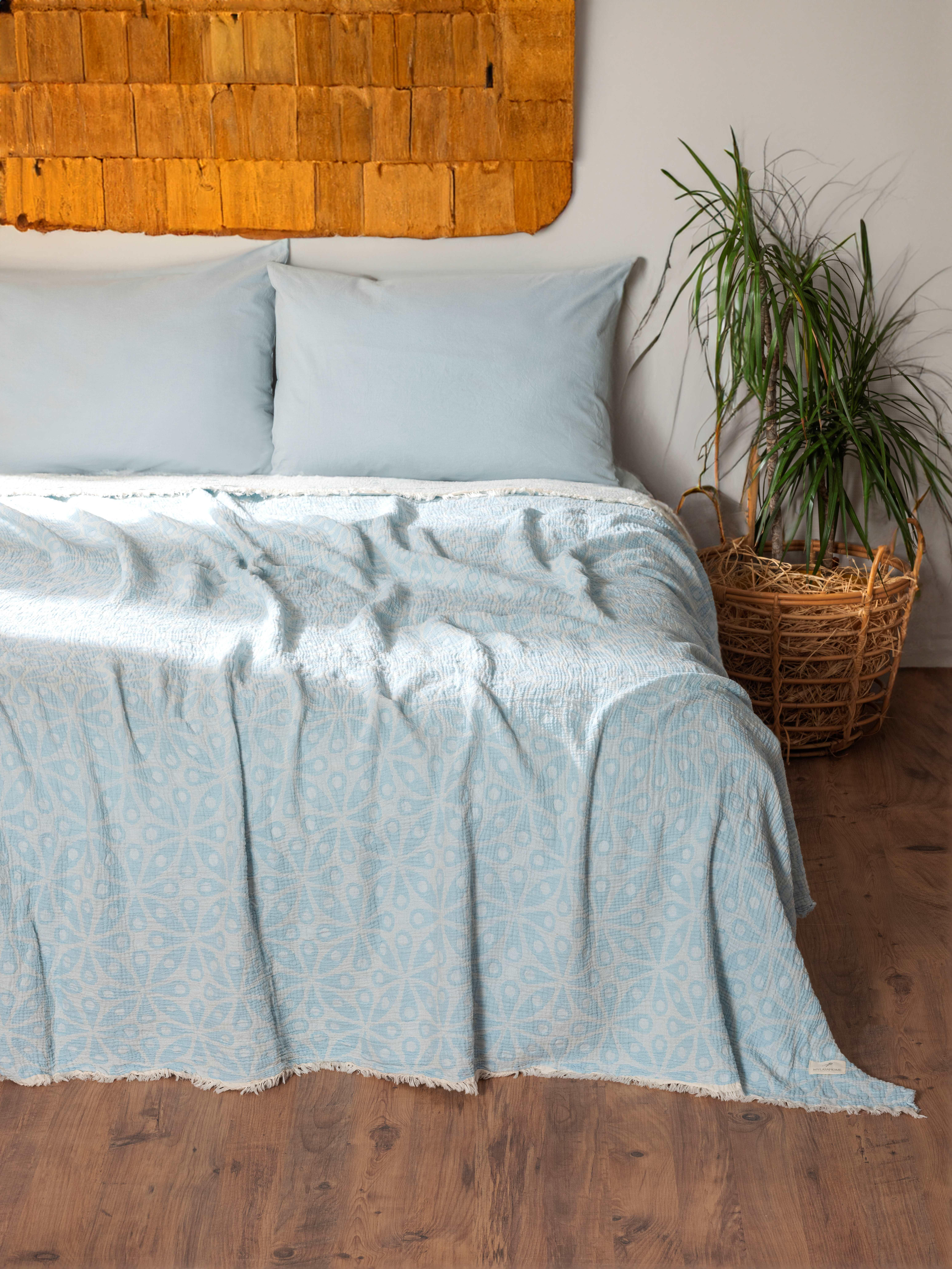 Mylasa Home Çift Kişilik %100 Organik Pamuk Müslin Yatak Örtüsü Damla Puantiye Desenli Mavi (77872)
