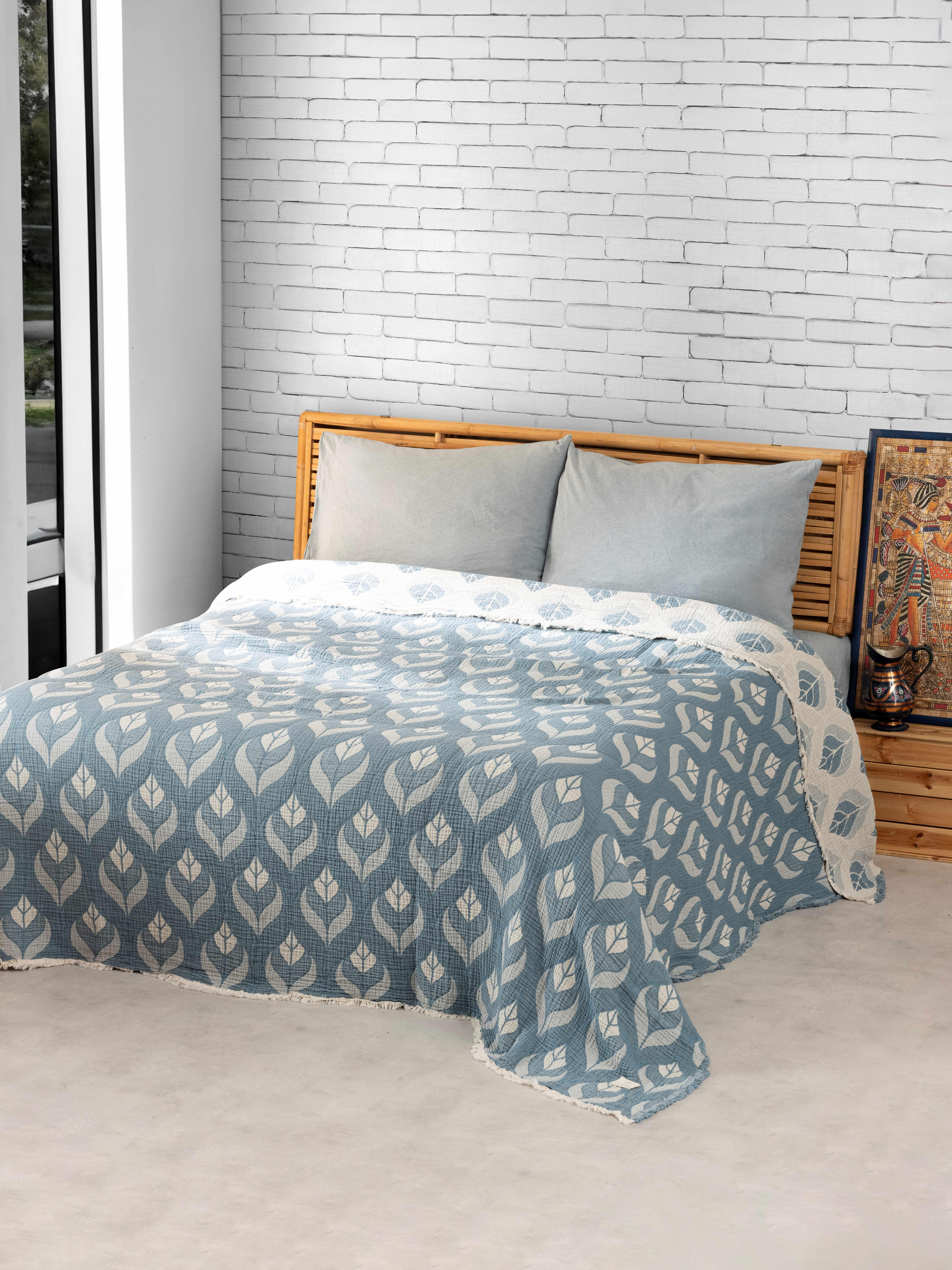 Mylasa Home Çift Kişilik Küçük Yaprak Desenli %100 Organik Pamuk Müslin Yatak Örtüsü Petrol (77913)
