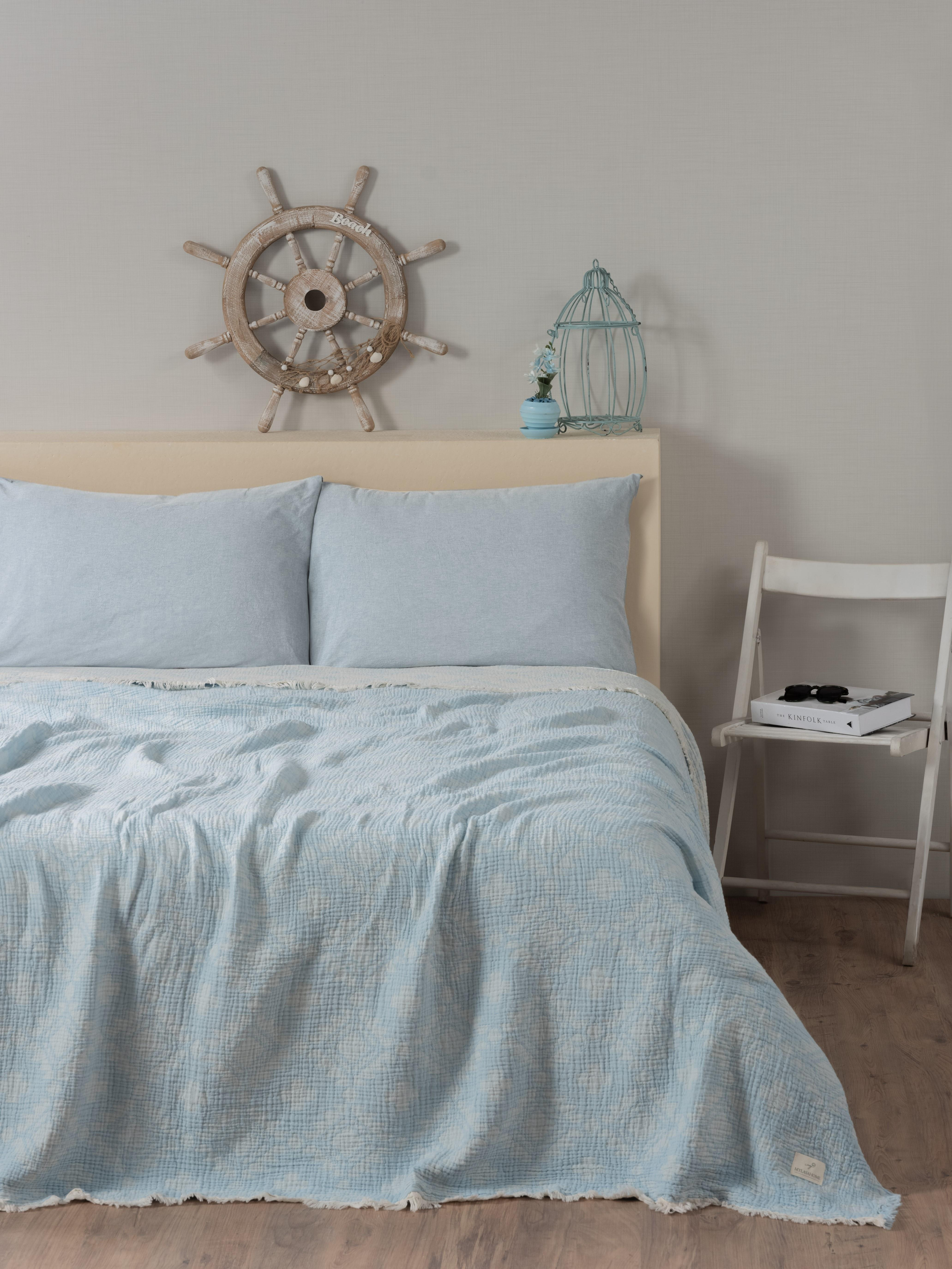 Mylasa Home Müslin 4 Katlı Aztec Desenli (Jakarlı) Çift Kişilik Yatak Örtüsü-Yazlık Pike 220x240cm - Açık Mavi (77845)
