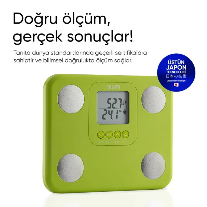 Taşınabilir kompakt hafif yapısı sayesinde dilerseniz seyahate gittiğinizde dilerseniz banyodan salona çok rahat şekilde taşımanıza elverişlidir. Tanita vücut analiz baskülü yeşil 150 kg taşıma kapasitesine sahiptir. Japon teknolojisine sahip bu sevimli cihazın Beyaz, Siyah, Neon Yeşil, Neon Pembe olarak 4 farklı renk alternatifiyle kullanıcının beğenisini kazanıyor. Canlı renkleri sayesinde cihazın dikkat çekiliciliği sayesinde evinizin havasını değiştireceğine emin olabilirsiniz.