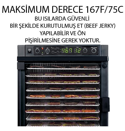 Normal kurutucularda kurutulmuş et (beef jerky) yapılmak istendiğinde makinenin düşük ısısından dolayı etin ön pişirilmesi gerekilir. Halbuki Sedona Express’in 75C’ye kadar çıkan ısısı sayesinde etlerinizi direk olarak kurutabilirsiniz. Amerikan Gıda güvenliğinden sorumlu bakanlığının beef jerk yapımı ile ilgili alınması gereken güvenlik önlemleri ile ilgili Ingilizce makalesine buradan ulaşabilirsini