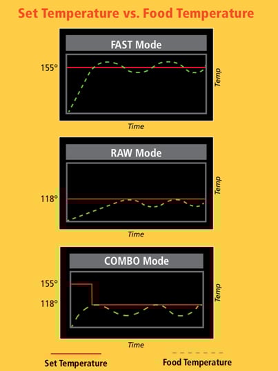 Fast ayarında olan ürününüzü 75C’ye kadar istediğiniz derecede çalıştırabilirsiniz. Bu ayarda çalışırken makine averaj bir ısı belirler ve bu makine içerisinde +/- 5C’ye kadar değişkenlik gösterebilir. “Raw” ayarında çalışırken ise aşırı ısınmaya karşı korunma sistemi sayesinde iç sıcaklık 48˚C’yi asla geçmez.
