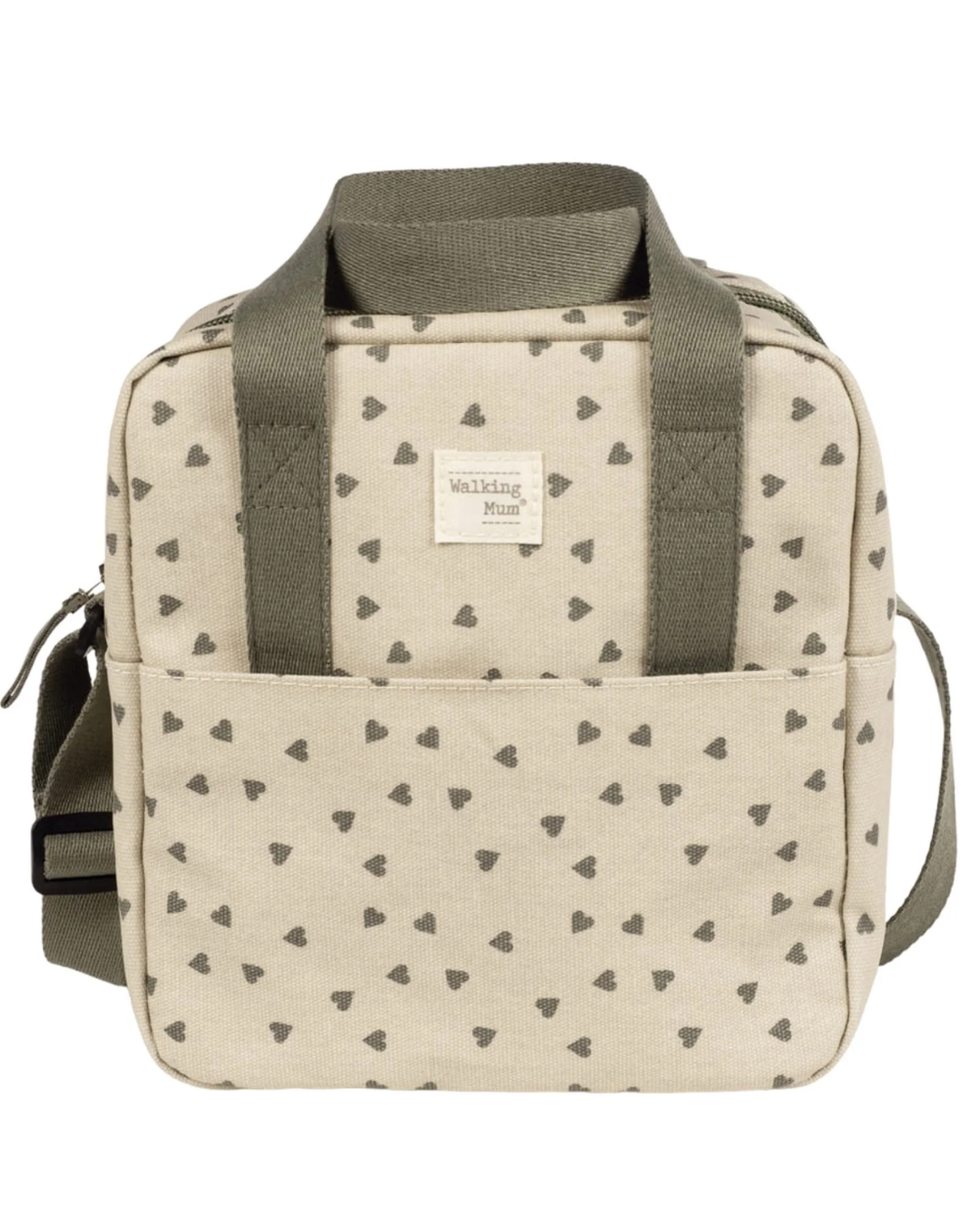Walking Mum Poppy Termos Çantası Moss serisine ait termal biberon çantası, zarif tasarımı ve yüksek fonksiyonelliğiyle annelerin en büyük yardımcısı olmaya aday. Şehirli ve modern tarzı yansıtan bu özel çanta, bebeğinizin biberonunu dört saate kadar ideal sıcaklıkta muhafaza eder. Isıyı koruyan yalıtımlı iç yüzeyi sayesinde hem dış mekan aktivitelerinde hem de kısa gezilerde kullanım kolaylığı sağlar. Yumuşak tonlarda tasarlanmış kalp desenli kumaşı, stil sahibi ebeveynlere hitap ederken, kaliteli kaplamalı pamuk yapısı uzun süreli dayanıklılık sunar. Azo boya ve zararlı kimyasallardan arındırılmış olması ile bebeğinizin sağlığını ön planda tutar. Omuz askısı ve elde taşımaya uygun kısa sapıyla ergonomik kullanım imkânı sunan bu kompakt çanta, her çantaya kolaylıkla sığar.